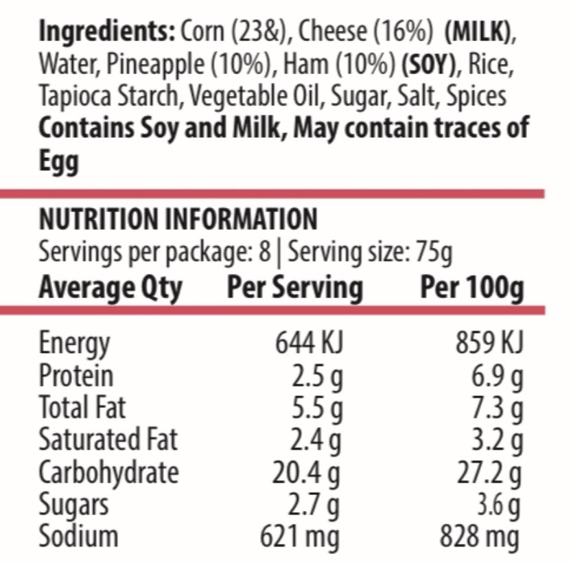 Our Hawaiian Empanadas are made of a delicious crunchy crust of pure corn, filled with a mixture of cheese, ham and pineapple to obtain a delightful texture and flavour. Already fried in vegetable oil, you only need to heat them in an oven/grill or airfryer for 13 to 15 minutes.
